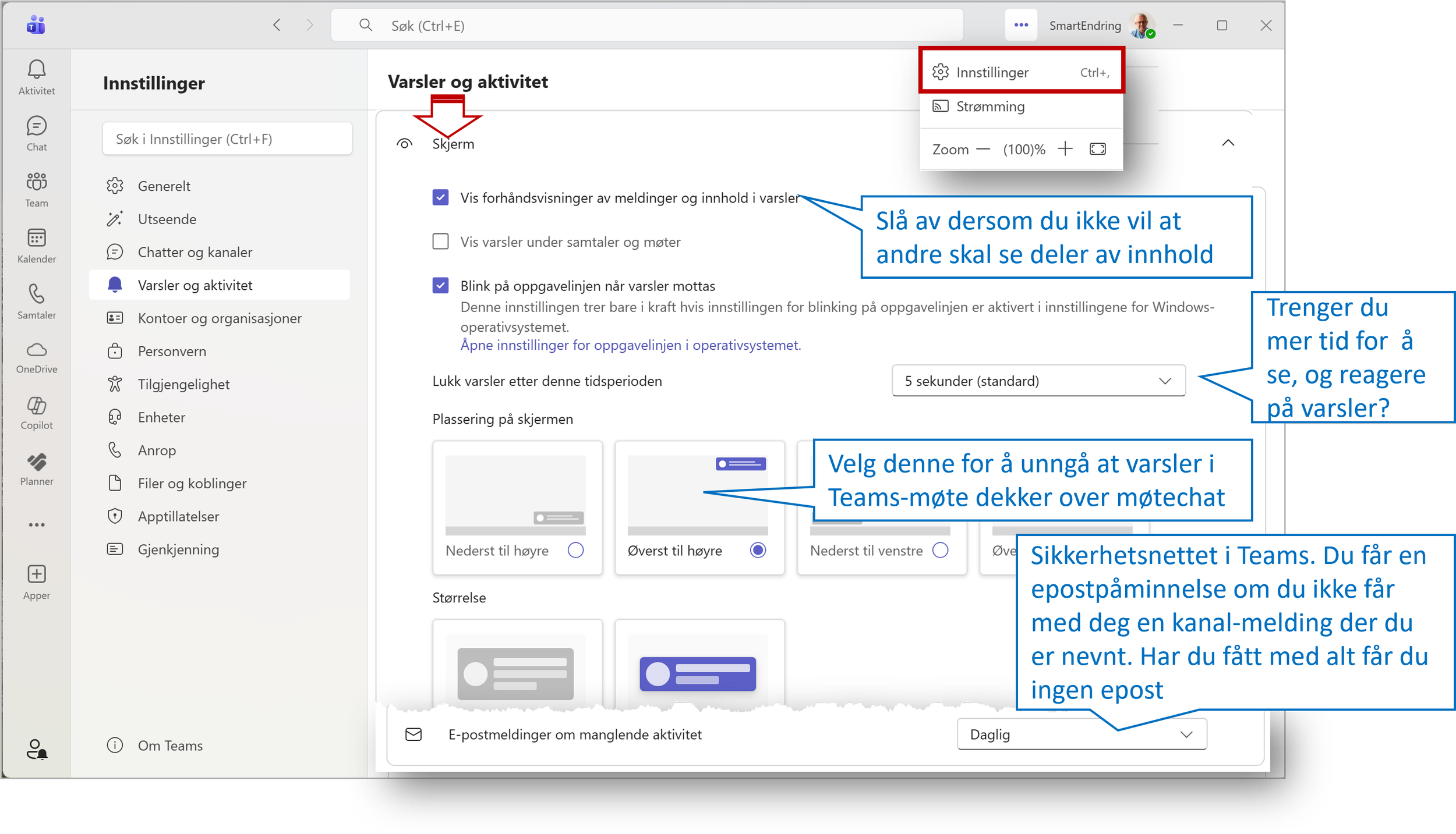 Men, varsler kan være nyttig når vi selv bestemmer over dem. Kanskje trenger du å gå igjennom varselinnstillingene i Teams og gjøre noen justeringer?