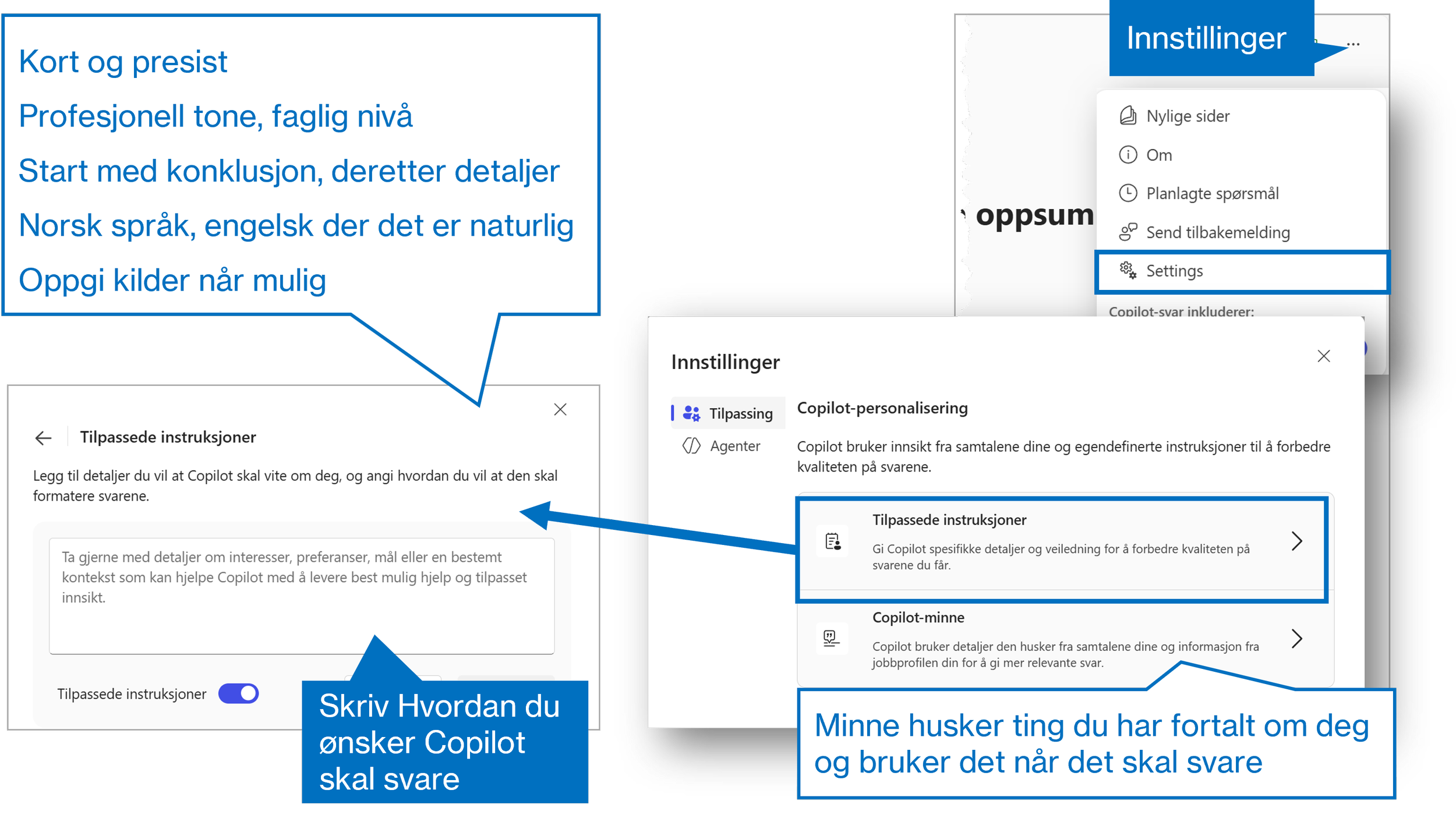 Men, det som er fint er at du kan tilpasse dem til dine preferanser. Det kan gjøres i innstillingene med minne og tilpasninger. Prøv det nå! I illustrasjonen ser du mine preferanser. Minnet kan oppdateres basert på det du skriver, men du kan også lagre et minne ved å skrive Husk, og noe du vil Copilot skal vite om deg.
