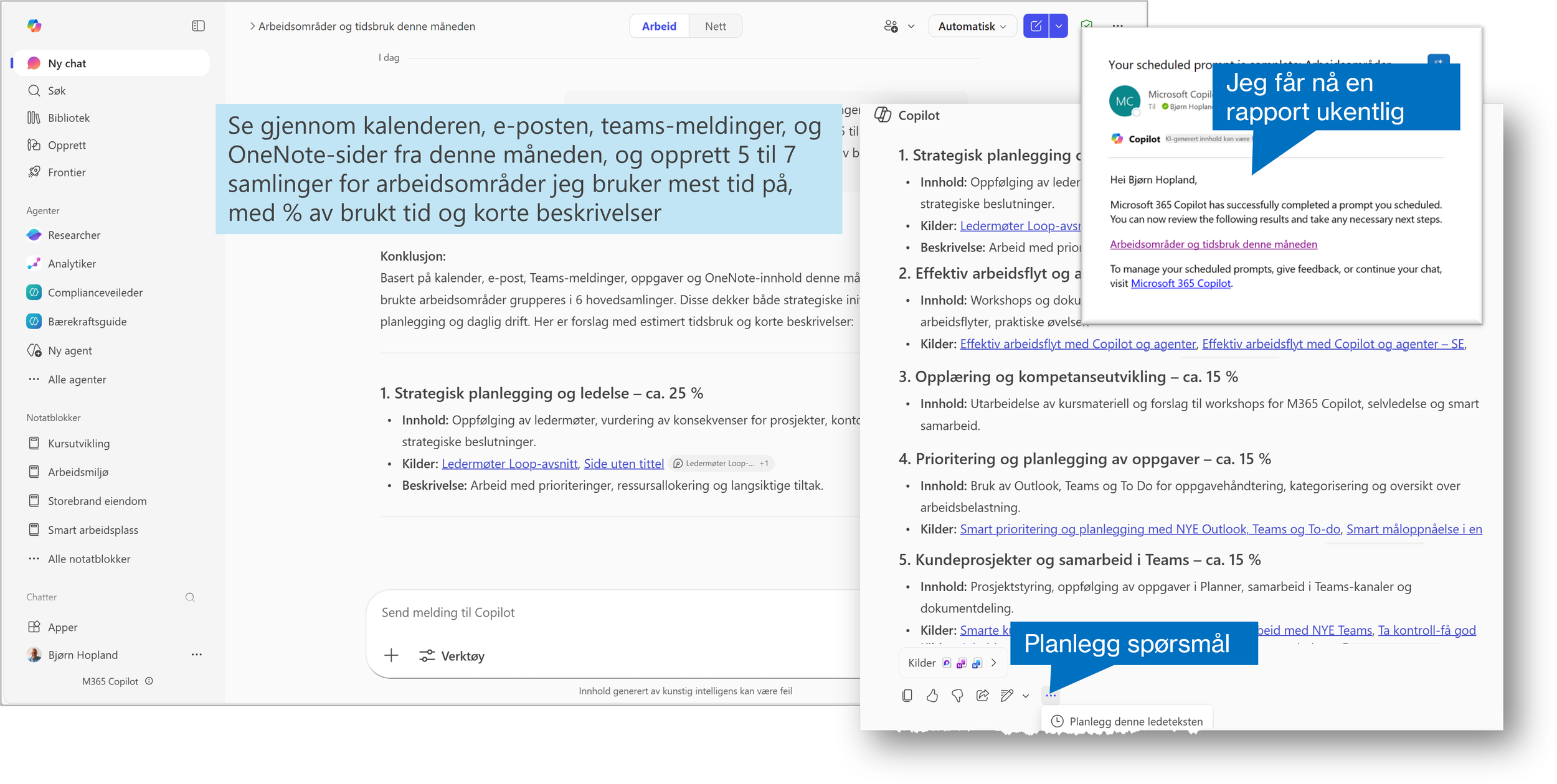 Sett opp en automatisk Copilot-spørring som gir deg fordeling mellom dine arbeidsområder ukentlig