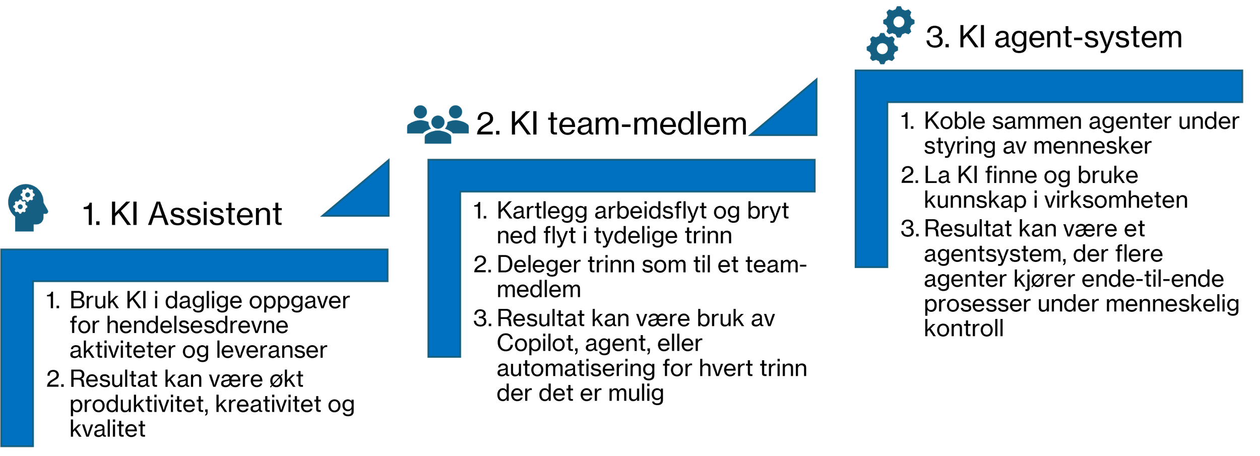 Ved å kartlegge en arbeidsflyt, og enten å bruke Copilot i en form, en agent eller automatisering kan du starte med det som er tilgjengelig for deg nå, og oppnå gevinster på nivå 2.